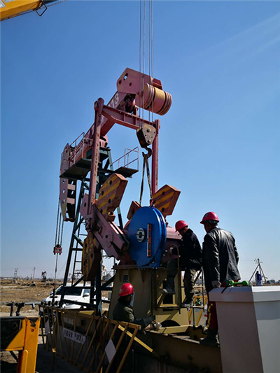 抽油機(jī)用永磁半直驅(qū)同步拖動裝置由半直驅(qū)同步電動機(jī)、同步電動機(jī)變頻控制箱和連接支撐三部分組成。 同步電動機(jī)專為油田游梁抽油機(jī)設(shè)計(jì)的低速大轉(zhuǎn)矩永磁同步電動機(jī),利用超薄機(jī)身(160mm),自然冷卻,直接驅(qū)動減速箱輸入軸,**節(jié)能,**可靠。變頻控制柜采用新一代高性能開環(huán)矢量變頻器,采用DSP芯片為控制核心,保證產(chǎn)品的可靠性和對各種環(huán)境的適應(yīng)性,功能強(qiáng)大,使用靈活,**沖次可以**到0.1次/分鐘。